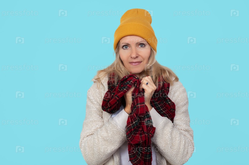 Взрослая красивая женщина в теплой зимней одежде на синем фоне