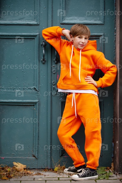 Подросток в оранжевом костюме стоит возле зеленой двери