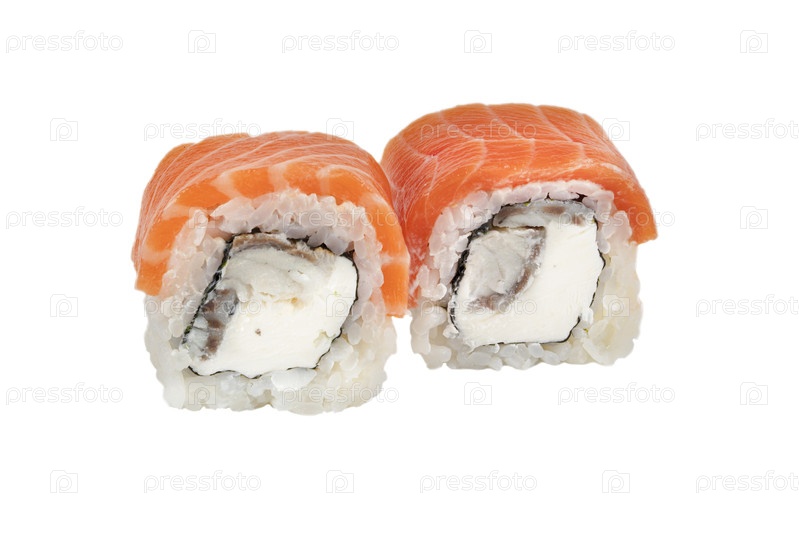 Ролл суши испечен с красной рыбой, форелью, сыром из Филадельфии и угрей. меню японского ресторана