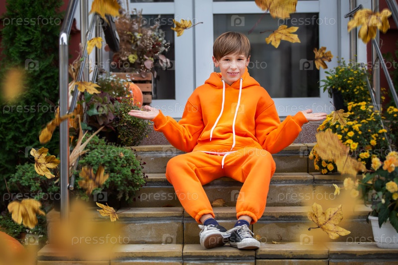 Мальчик в оранжевой одежде сидит на ступеньках и смотрит на желтые летающие осенние листья