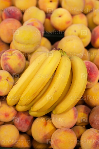 Ветвь желтых спелых бананов и персиков.Тропические фрукты для продажи