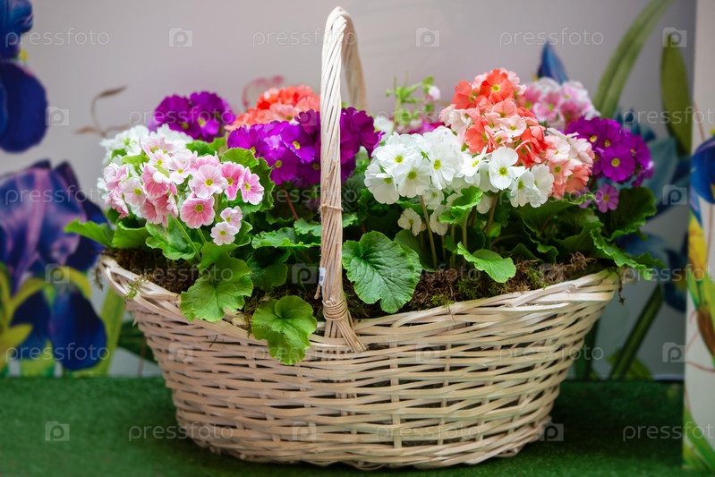 Многоцветные сорта весенне-цветущей первички в плетеновой корзине