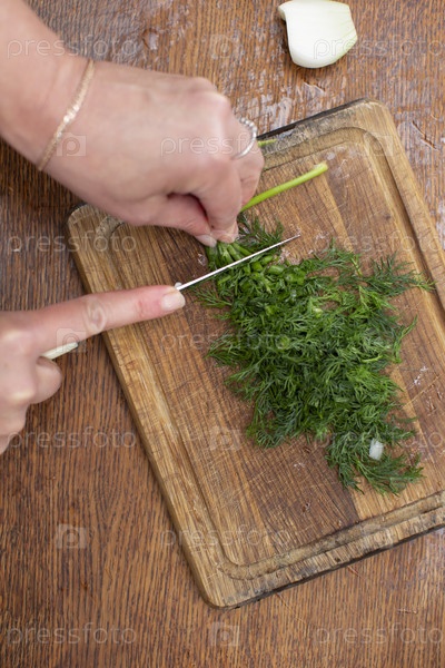 Руками нарежьте укроп на режущей доске.Сделайте овощный салат