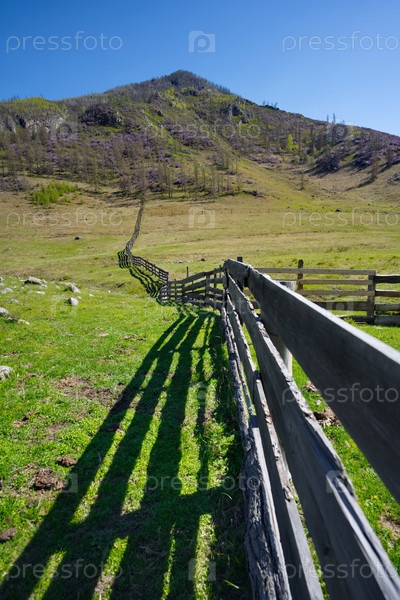 Юг Западной Сибири, Алтайские горы. Вид на деревянный предварительно сделанный забор, простирающийся до склонов гор в перспективе, освещенный закатом солнечного света