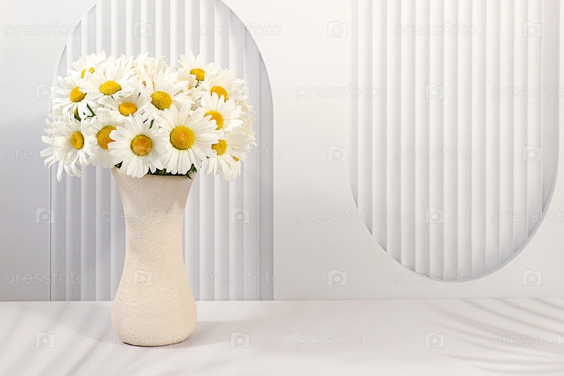 Красивые ромашковые цветы в вазе на элегантном современном фоне, весенний и летний рекламный баннер, абстрактная цветковая аранжировка, праздничная открытка с пространством для текста