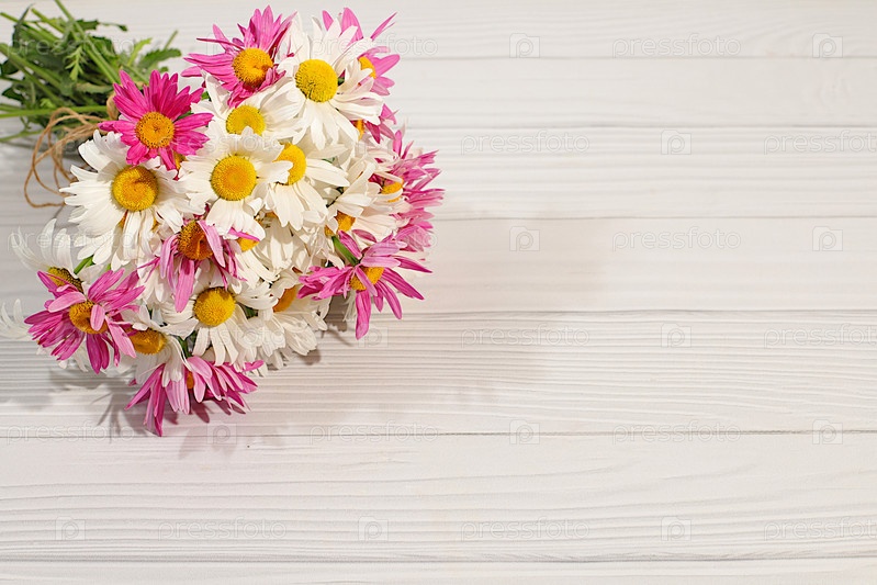 Букет красивых цветов садовой ромашки и мальвы на деревянном солнечном фоне, рекламный баннер весенних и летних продуктов, абстрактная цветочная аранжировка, открытка с местом для текста