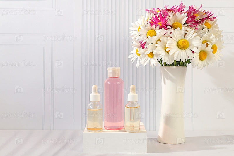 Уэлнес-композиция с косметической водой и свежими цветами садовой ромашины и малвы, рекламная карта спа, концепция естественного самообслуживания и здорового образа жизни, абстрактная композиция с цветками