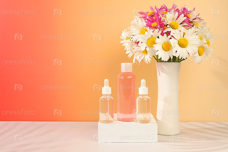 Уэлнес-композиция с косметической водой и свежими цветами садовой ромашины и малвы, рекламная карта спа, концепция естественного самообслуживания и здорового образа жизни, абстрактная композиция с цветками