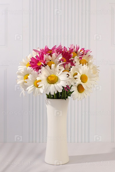 Натюрморт с красивыми цветами ромашки в вазе на элегантном современном фоне, весенний и летний рекламный баннер, абстрактная цветовая аранжировка, праздничная открытка с пространством для текста,