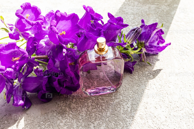 Элегантная бутылка женского парфюма с нежным цветочным ароматом на фоне шикарной лиловой ветки садовых колоколов