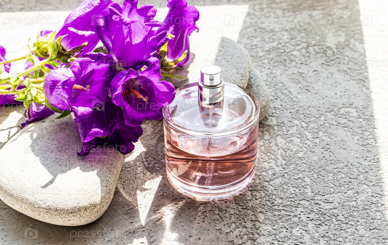 Роскошная бутылка женского парфюма стоит на сером цементном фоне с круглыми камнями и шикарными фиолетовыми цветами. Копия пространства. Колокол