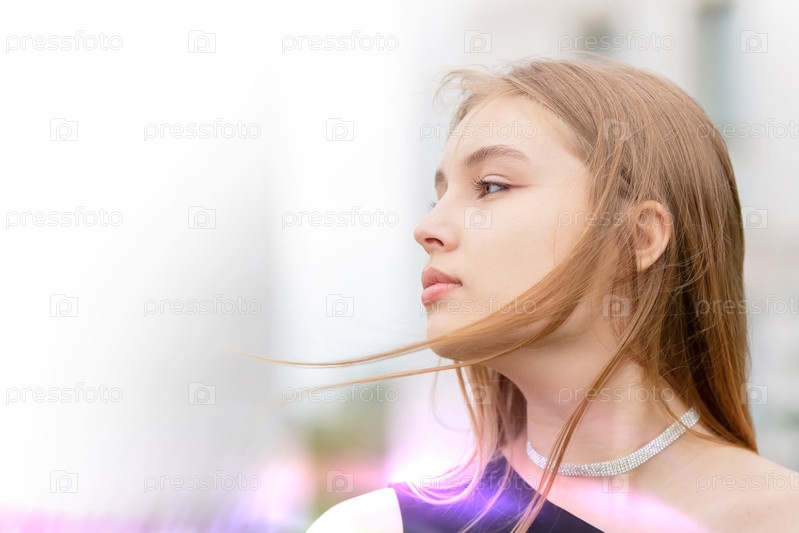 Красивая женщина в профиле с летящими волосами на фоне боке.Портрет молодой романтической девушки