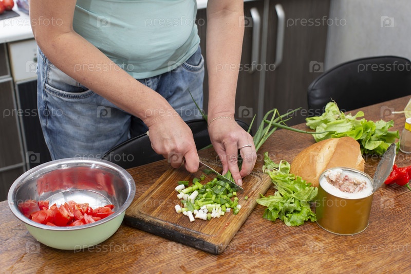 Нарежьте зеленый лук и помидоры, поместите их в чашу.Сделайте салат