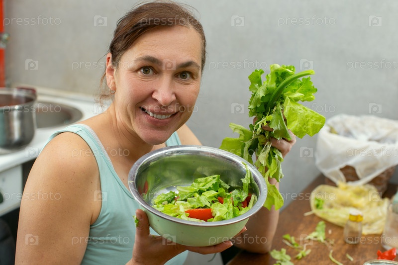 Женщина показывает миску с овощами и травами со листьями салата перед кухней