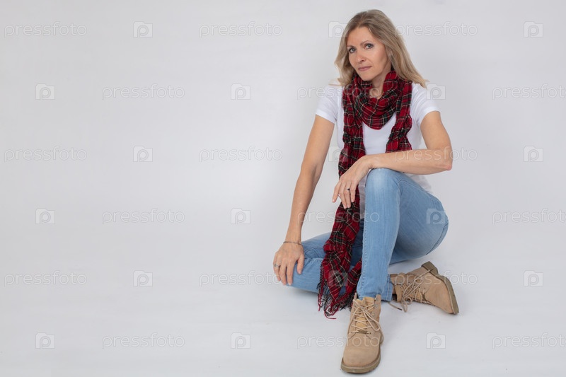 Взрослая красивая стройная женщина в джинсах и сапогах позирует, сидящая в студии