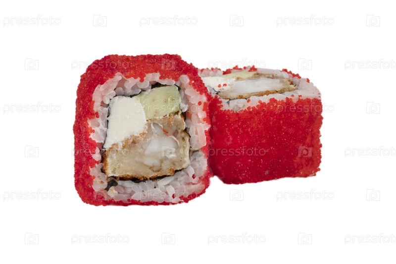 Рулоны суши, забитые красной искусственной икры на белом фоне