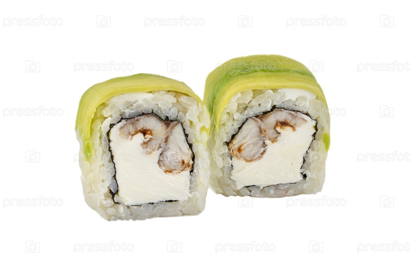 Рулоны суши на белом фоне с сыром из Филадельфии, авокадо и тунцом