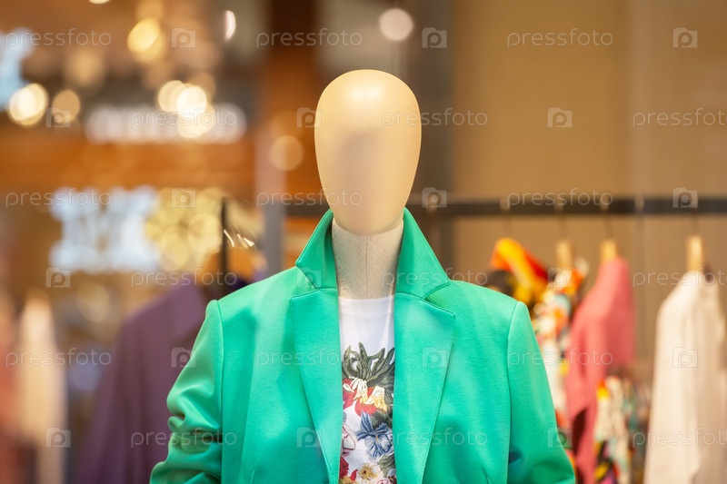 Женский манекен в зеленой куртке за стеклом витрины магазина