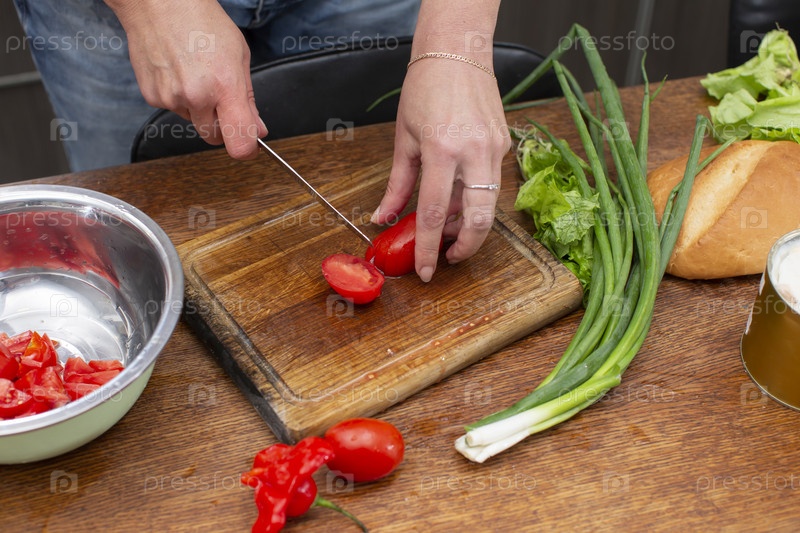 Нарежьте зеленый лук и помидоры, поместите их в чашу.Сделайте салат