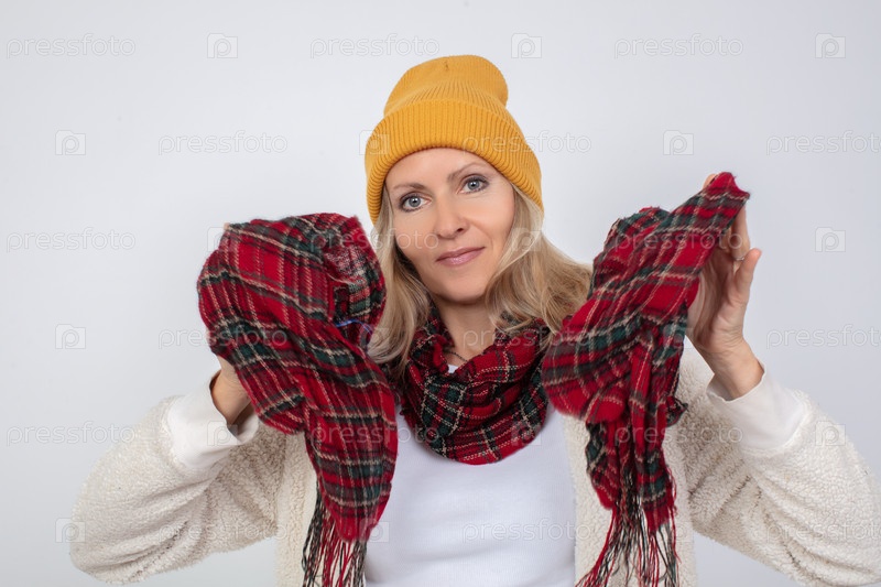 Большой портрет пожилой женщины в вязанной шляпе, завернутой в шарф на холоде на сером фоне