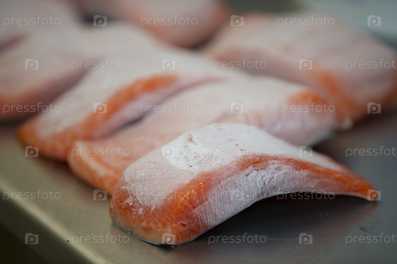 Замороженные кусочки рыбы красного лосося на металлическом столе