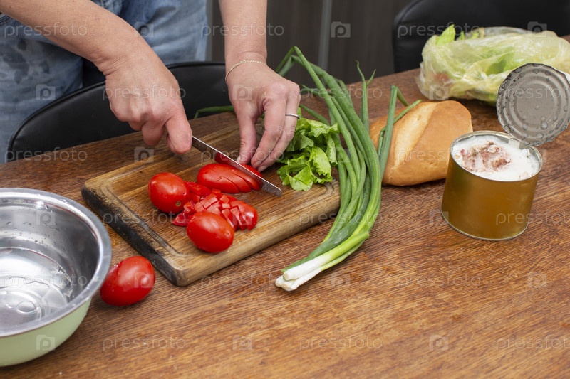 Нарежьте зеленый лук и помидоры, поместите их в чашу.Сделайте салат