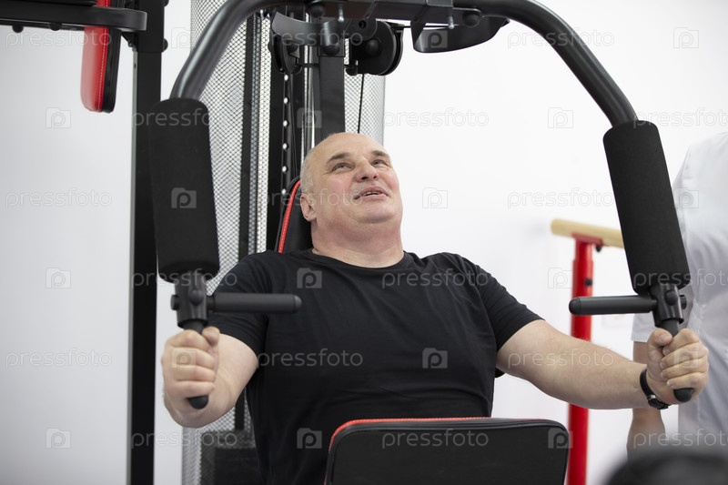 Пожилой мужчина работает на спортивном автомобиле, накачивая мышцы рук