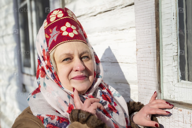 Пожилая русская женщина в традиционном головном уборе Кокошник позирует на фоне деревенского дома