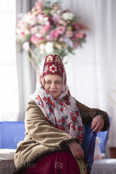 Красивая пожилая русская леди в национальном кокошническом головном уборе и овечьем пальто улыбается и смотрит в камеру