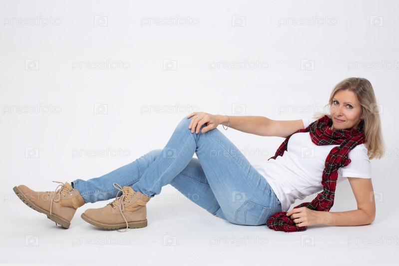 Взрослая красивая стройная женщина в джинсах и сапогах позирует, лежа в студии