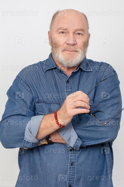 Портрет привлекательного серого мужчины в джинсовой рубашке, изолированного на сером фоне