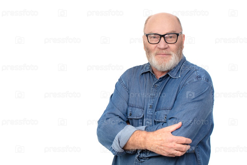 Портрет привлекательного серого мужчины в джинсовой рубашке, изолированный на белом фоне