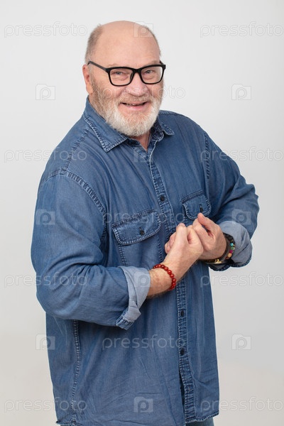 Портрет привлекательного серого мужчины в джинсовой рубашке, демонстрирующего силу на белом фоне. бородатый дед европейского типа весел и счастлив