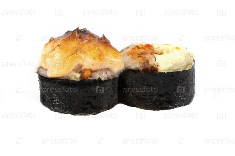 Близкий снимок суши изолирован на белом фоне.Суши с запеченными водорослями нори