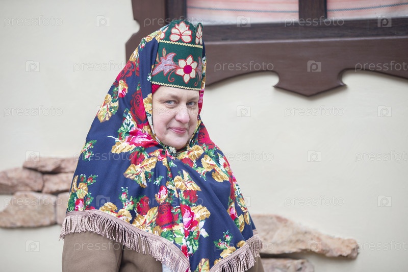 Пожилая русская женщина в традиционном головном уборе Кокошник позирует на фоне деревенского дома
