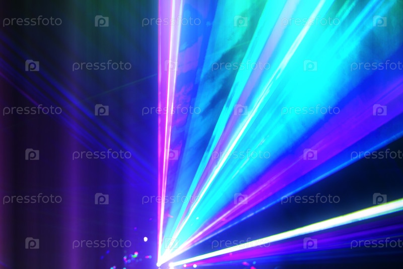 Лазерно-синие и белые лучи света на темном фоне