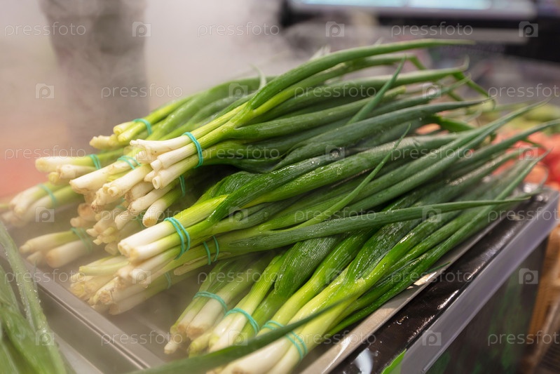 На столе стоит куча зеленых луков, они мокрые и обернутые пластиковыми галстуками