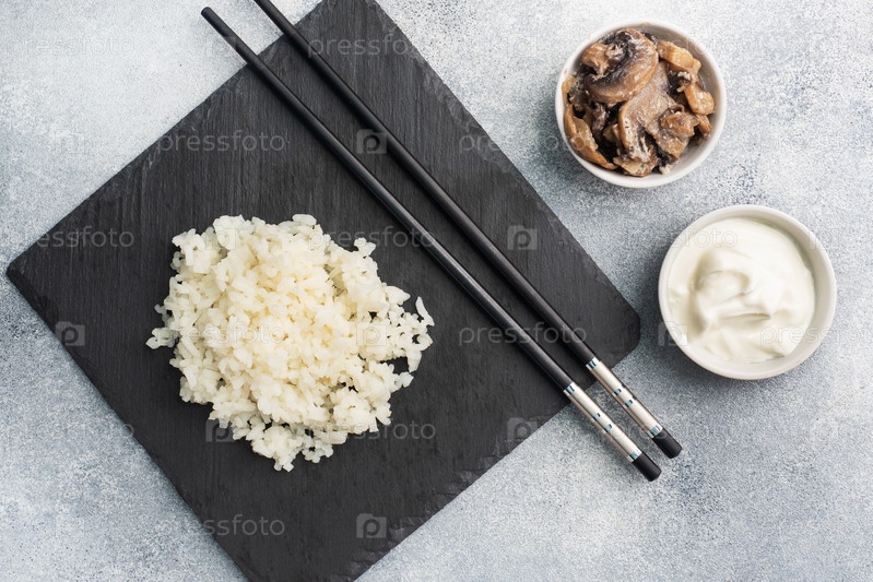 Приготовленный белый рис и грибы в сметане на черном подставке. серый бетонный фон Копировать пространство