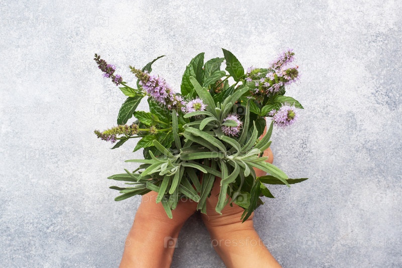Группы свежих веток мяты и розмарина. Женские руки держат букет ароматных трав. Серый бетонный фон