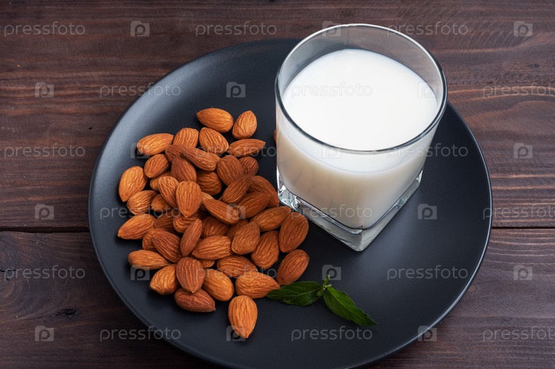 Миндальное молоко в стеклянных бокалах на тёмном деревянном фоне