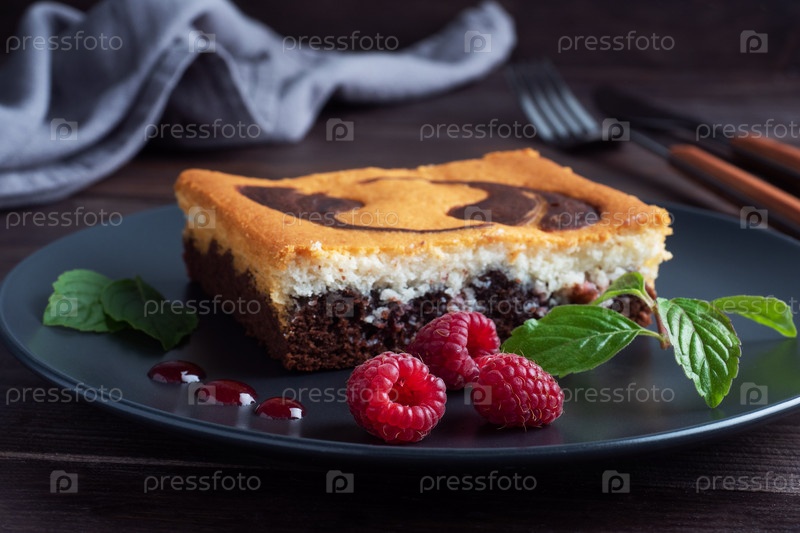 Кусок двухслойного торта на тарелке из шоколадных пирогов и cheesecake с малиной