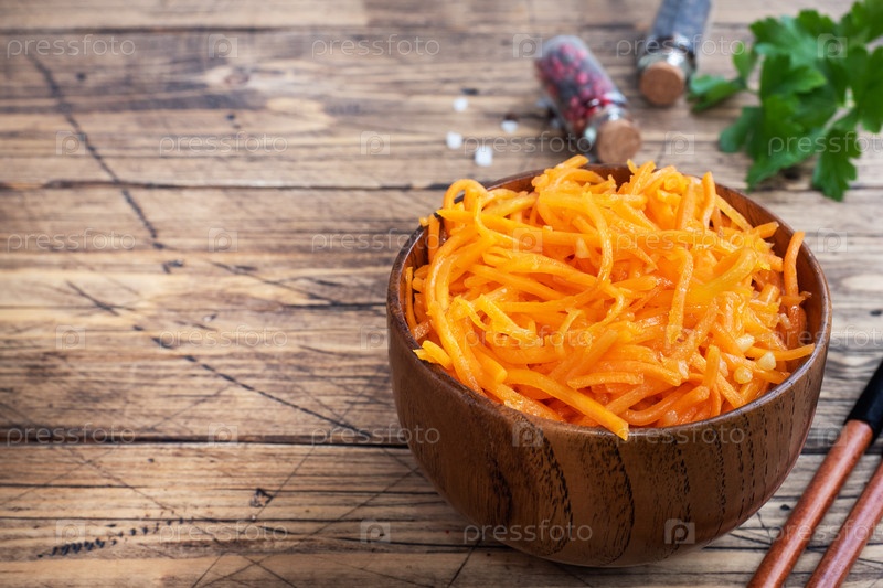 сырой гребенчатый пряный салат из моркови в миске. корейские морковь с специями и соусом. copy space