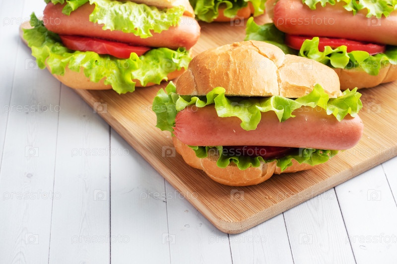 несколько хот-догов на деревянной доске хот-дог со салатом помидора и колбасой скопировать пробелы