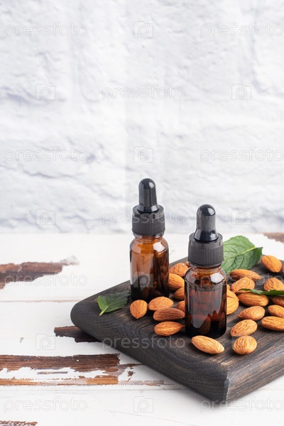 Миндальное эфирное масло в темных стеклянных пузырях и свежих миндальных орехах.Ароматерапия с натуральным органическим косметическим маслом