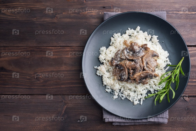 Ризото с грибами на черной тарелке. вареный белый рис с грибами в сливочном соусе. темный деревянный фон. копирование пробела
