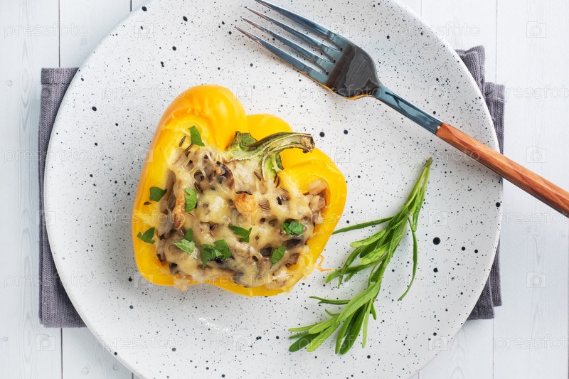 Наполненный сладким перцем с рисовыми грибами и сыром с травами. Выпеченные половины желтого перца с начинкой. Белый деревянный фон