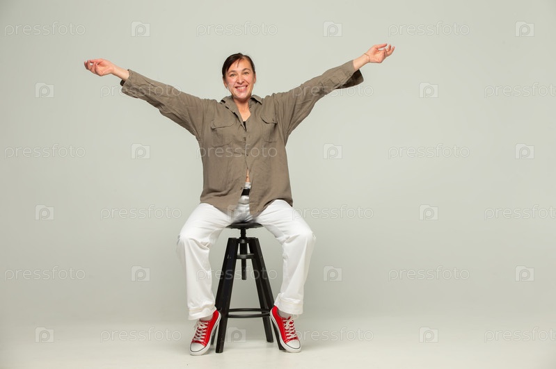 Женщина средних лет в непринужденной одежде и красных кроссовках позирует с улыбкой в студии на сером фоне с распростертыми руками