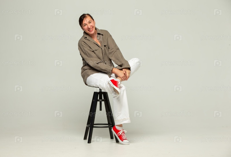 Женщина средних лет в непринужденной одежде и красных кроссовках позирует с улыбкой в студии на сером фоне