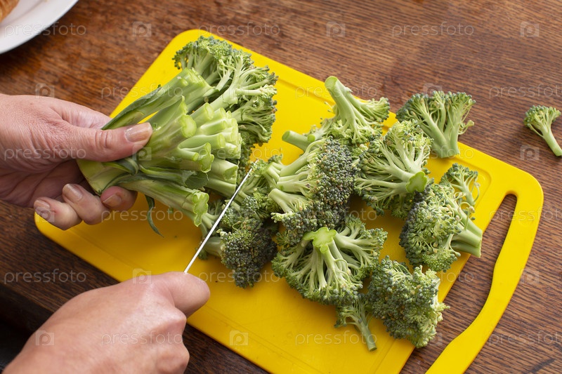 Руки режут брокколи.Здоровые зеленые овощи