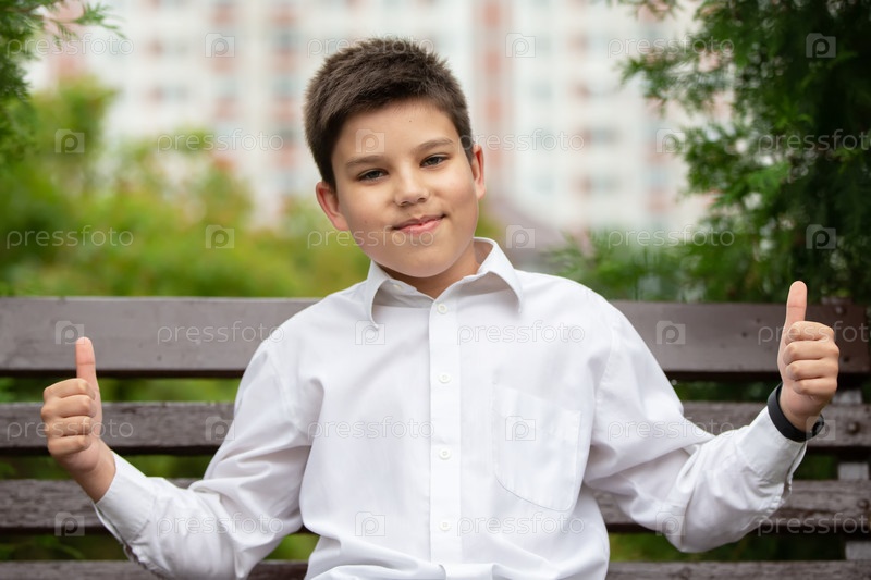 Мальчик показывает классный знак среди летних зеленых насаждений